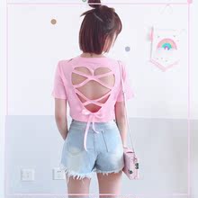 韩版甜美小清新女装后背镂空蝴蝶结短袖T恤短款套头学生纯色上衣