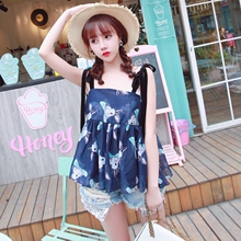 夏装甜美女装可爱兔子印花系带蝴蝶结吊带上衣荷叶边收腰小背心女