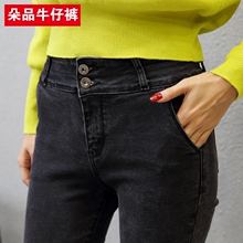 朵品2016秋冬韩版黑灰色显瘦高腰双扣牛仔裤女九分紧身弹力小脚裤