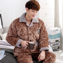 冬季男士睡衣加厚长袖珊瑚绒夹棉睡衣男法兰绒三层棉袄家居服套装