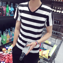 韩版男装男士条纹短袖t恤V领紧身体恤修身打底衫夏季半袖上衣服男
