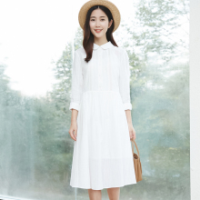 宿本春装新款文艺纯棉白色长袖系带娃娃领衬衫裙连衣裙收腰中长裙