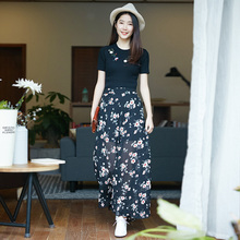 宿本 文艺开叉高腰碎花雪纺半身裙长裙夏修身显瘦a字裙中长款裙子