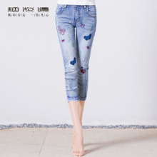 烟花烫XF2017夏装新款女装气质修身百搭刺绣七分牛仔裤 颜青