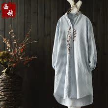 西缺原创 民族风刺绣衬衣 中长款宽松棉麻条纹衬衫女夏季开衫上衣