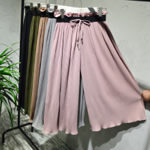 韩版夏季木耳荷叶边高腰显瘦雪纺百褶阔腿裤女宽松九分休闲裤裙子