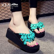 2016新款手工串珠手缝人字拖厚底松糕坡跟拖鞋沙滩女鞋拖鞋凉鞋子