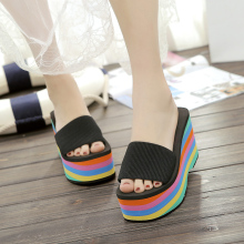 新款超高跟一字拖鞋女夏季彩虹松糕底弹力布带坡跟韩版厚底凉拖鞋