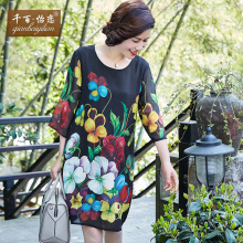 千百怡恋中老年女装中袖宽松大码中长款裙子妈妈装夏装雪纺连衣裙