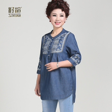 籽煊妈妈装春装上衣薄牛仔T恤中老年女装外套大码中年衬衫40-50