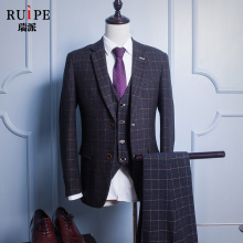 Ruipe格纹西服结婚礼服男士韩版修身英伦休闲套装格子西装三件套