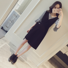 2017夏季新款韩国显瘦宽松简约条纹拼接假两件短袖连衣裙女
