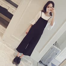 2017春季新款韩国宽松显瘦纯色阔腿背带裤女雪纺两件套吊带休闲裤