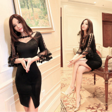 天天特价新款女装性感透视网纱拼接五分袖喇叭袖修身前开叉连衣裙