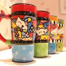 仟度 彩绘陶瓷杯 创意时尚马克杯 带盖带勺咖啡杯 大容量卡通水杯