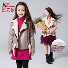 恋采依童装女童冬装外套中大儿童欧美风斜拉链加绒皮夹克皮衣外套