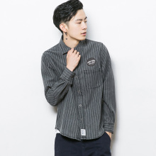 苎萝春秋工装条纹休闲衬衫日系复古翻领修身长袖衬衣外套潮男上衣