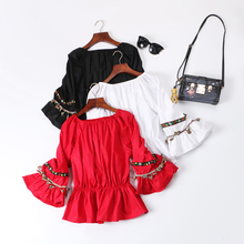 9829时尚名媛气质2017女装小香风一字领长袖套头民族袖上衣