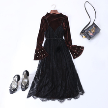 抢眼名媛气质喇叭袖丝绒连衣裙春装新款套装蕾丝吊带两件套女