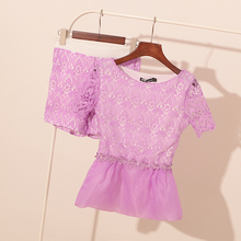 8708夏款韩版淑女修身钩花镂空拼欧根纱短袖上衣内衬短裤套装
