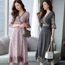 2017夏装新款波西米亚沙滩长裙海边度假V领雪纺甜美碎花连衣裙女