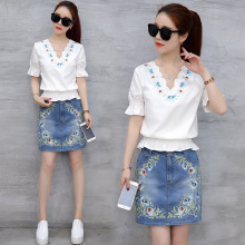 2017夏季新款女装韩版刺绣印花牛仔a字裙两件套连衣裙短裙套装潮