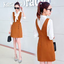 连衣裙女2017春装新款韩范修身蝴蝶结长袖衬衫背带裙两件套装裙潮