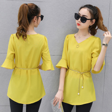 2017夏装新款韩范修身中长款小香风系带雪纺衫女装显瘦短袖上衣潮