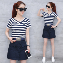 2017新款春夏女装两件套裙子时尚套装短裙条纹短袖夏季连衣裙女潮