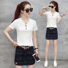 连衣裙套装女2017春夏新款韩版短袖白色棉t恤+牛仔半身裙裤两件套