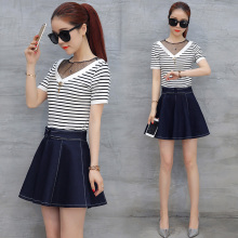 夏季套装裙女装新款2017时尚名媛条纹短袖t恤牛仔A字两件套连衣裙