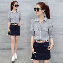 两件套连衣裙女2017春装新款韩范条纹长袖衬衫A字半身裙显瘦套装
