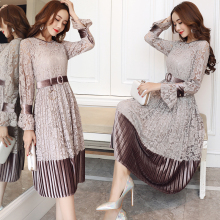 2017春装新款百褶镂空长裙收腰修身喇叭长袖百褶打底裙蕾丝连衣裙