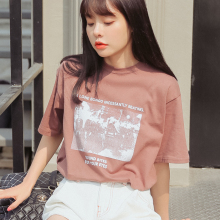 2017夏季女装韩版原宿BF风咖啡色印花短袖T恤上衣chic简约打底衫