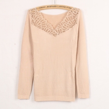 新款V领修身保暖内衣女加厚加绒 袖子不加绒时尚蕾丝外穿保暖上衣