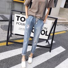 春夏装新款日系可爱小猫刺绣抽绳松紧腰休闲宽松牛仔九分裤女长裤