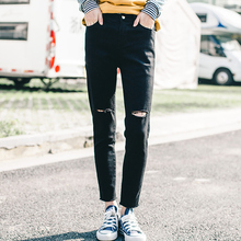 尔给春季新款学生修身铅笔裤烟管裤黑色破洞小脚九分休闲裤女裤子