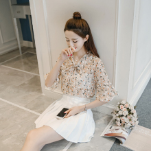 2017夏季新款韩版宽松短袖V领碎花雪纺衫女百搭喇叭袖雪纺上衣潮