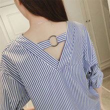 2017夏季新款韩版宽松显瘦喇叭袖中袖条纹衬衫女V领露背衬衣上衣