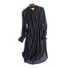 外贸女装时尚抽绳收腰开衩小立领中长款雪纺连衣裙5737
