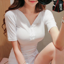 低胸t恤女 白色大码打底衫紧身短袖上衣学生修身显瘦V领性感女装