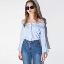 RICHCOCO甜美一字领吊带露肩上衣宽松喇叭长袖条纹衬衫女装夏学生