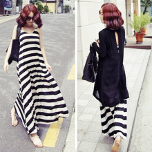 黑白条纹背心长裙女夏韩国宽松长款沙滩裙无袖吊带连衣裙超长裙子