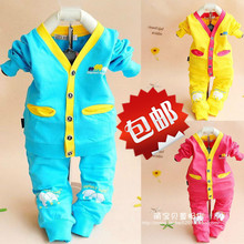0婴儿春装套装9新生儿衣服冬季宝宝棉衣三件套背带裤加厚1岁6个月