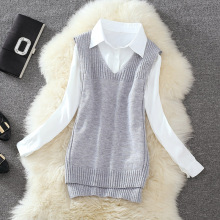 毛衣马甲女2017春装韩版新款V领针织马夹+翻领衬衣两件套女针织衫
