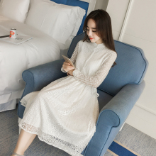中长款镂空睫毛蕾丝连衣裙女长袖韩版打底长裙子春装2017新款女装