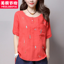 2017夏装新款棉麻短袖t恤女装韩版宽松休闲亚麻小衫刺绣大码上衣