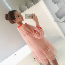 MOSS定制2017春季粉色宽松喇叭袖荷叶边短裙蕾丝连衣裙女AD71088