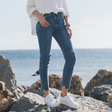 空气猫|春季新款 不规则裤腿 破洞紧身显瘦牛仔裤女八分小脚裤