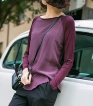 快乐123优雅 亲肤莫代尔真丝拼接 圆弧下摆 圆领长袖T恤 女